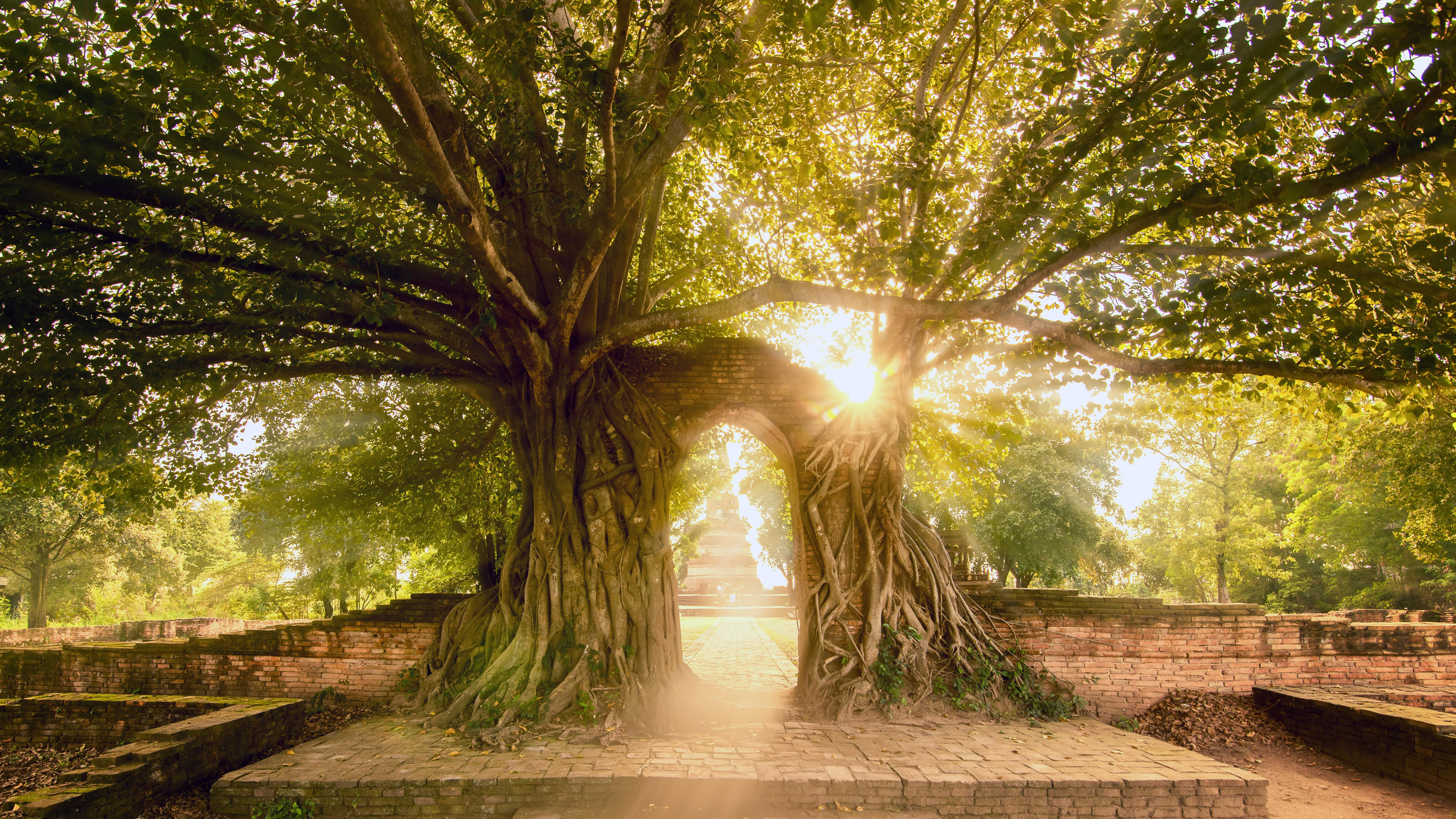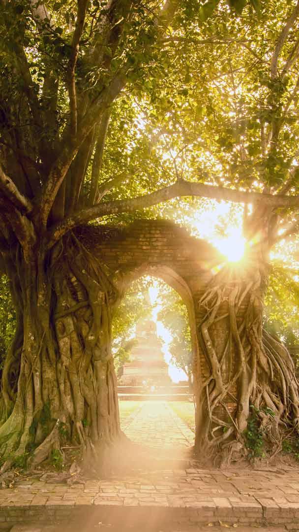 Wat Phra Ngam, also known as the Monastery of the Beautiful Buddha, is situated in the Ayutthaya Historical Park, Ayutthaya, Thailand. This abandoned monastery holds an enchanting charm with its arch embraced by a Bodhi tree, symbolising the place where Lord Buddha attained enlightenment. The arch, often referred to as "The Gate of Time", gets illuminated by the light of the setting sun, creating an ambiance that transports us back to the bygone days. It"s no wonder that this remarkable arch has become a spot for tourists to visit and capture in photographs. In 1991, a portion of the Ayutthaya Historical Park was declared a UNESCO World Heritage Site.