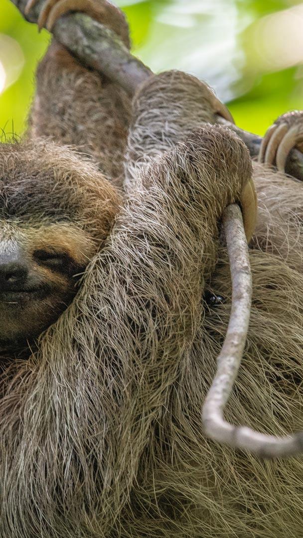 The world"s slowest mammal takes the spotlight in today"s image. There are six living sloth species, divided into two types: three-toed sloths and two-toed sloths. The three-toed sloth, a laid-back, tree-loving mammal that"s right at home in the tropical regions of South and Central America. They have short tails and three clawed toes on each limb, which help them cling onto branches with ease. Sloths are mainly leaf eaters, although they also snack on fruits, and tree sap to keep them going. To help them break down those tough, fibrous leaves, they have a special multi-chambered stomach. With their super slow metabolism, digestion takes its sweet time, and they don"t need much food each day to get by. It"s not just their stomachs that move at a leisurely pace; they"re so slow-moving that algae often develop on their fur, giving a greenish tint, which handily also provides them camouflage.