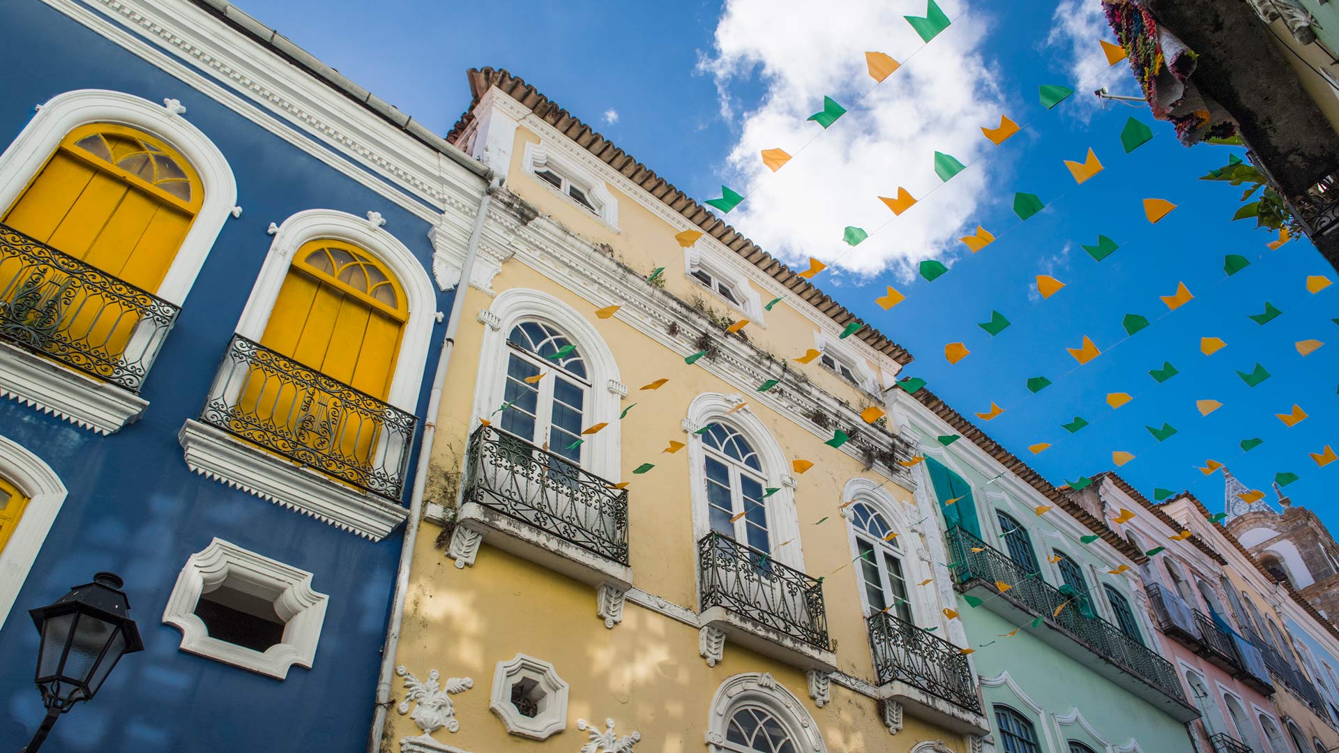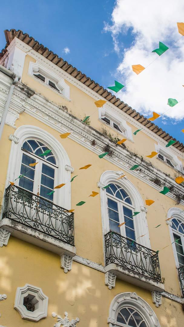 Olha a cobra! Rua em Salvador decorada com bandeiras coloridas entre prédios (© Henn Photography/Aurora Photos/Getty Images)