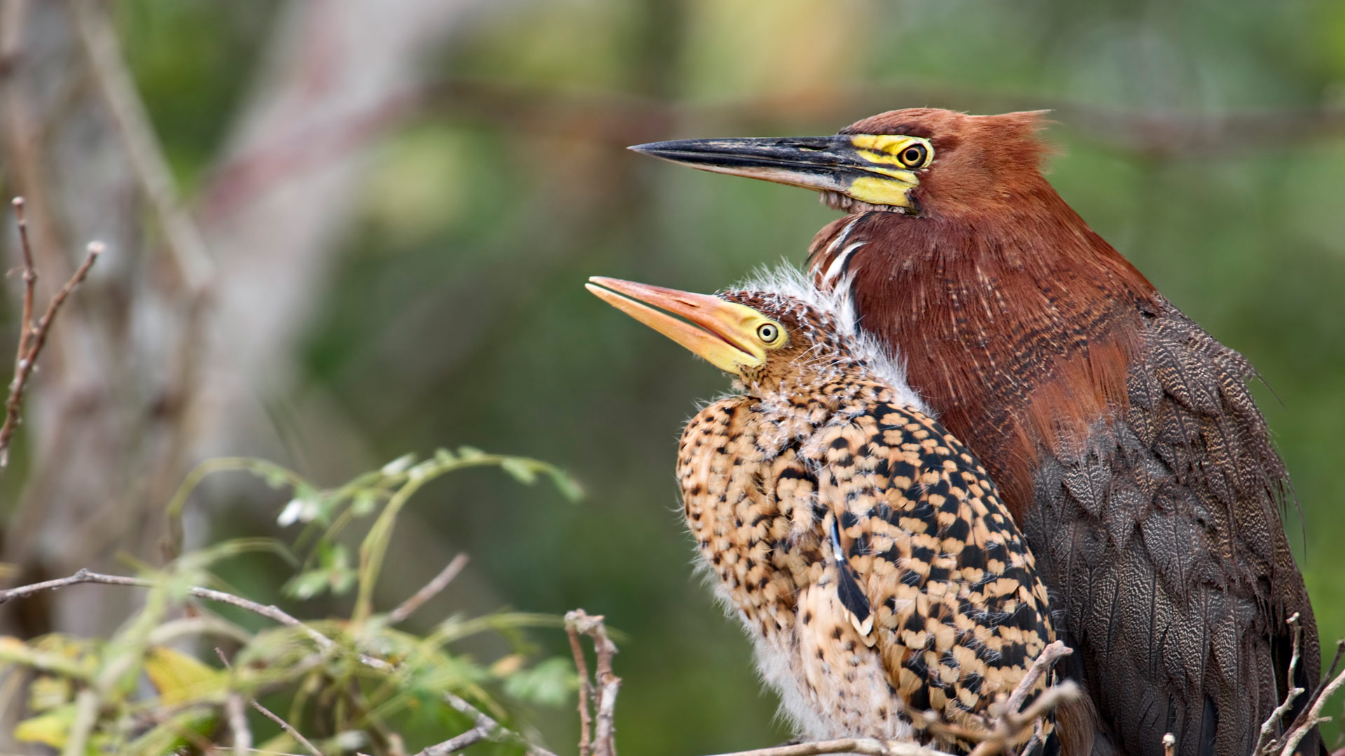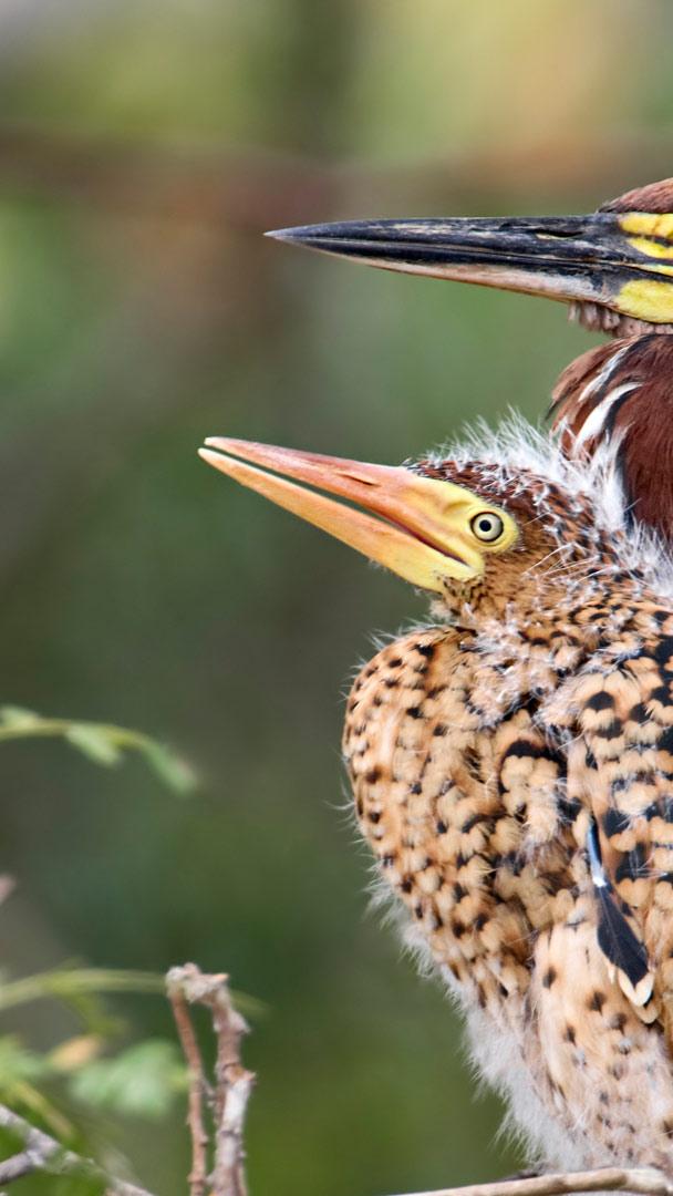 Um momento de pai e filho Garça-tigre-ruiva (Tigrisoma lineatum) adulta e filhote no ninho, Mato Grosso, Pantanal (© Ben Cranke/Minden)