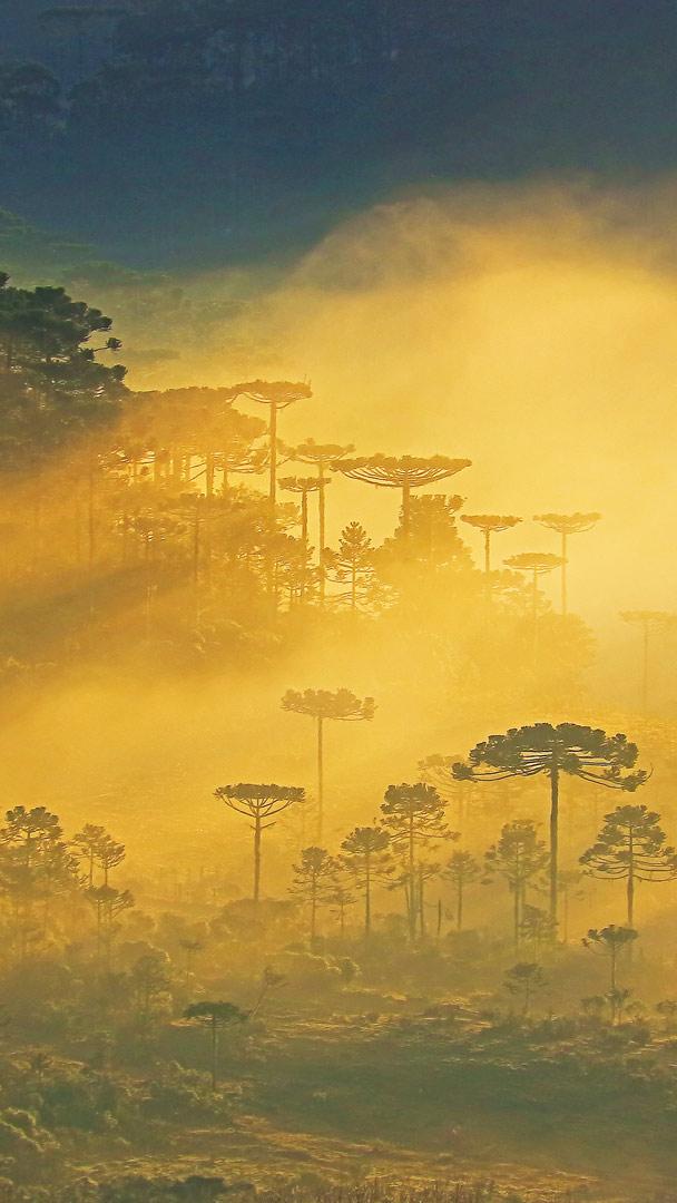 Uma neblina misteriosa Pinheiros de araucária em um amanhecer enevoado, paisagem próxima a Gramado, Rio Grande do Sul (© iStock/Getty Images Plus/Getty Images)