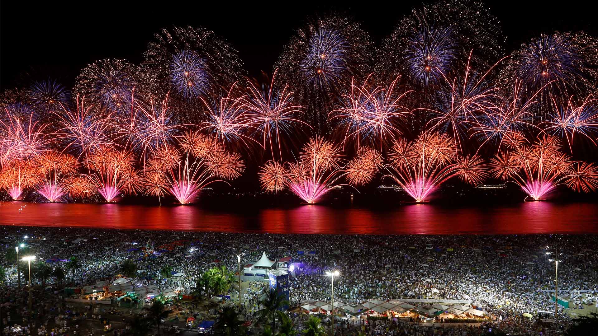 É meia-noite no Rio! Queima de fogos de Ano-Novo na Praia de Copacabana, Rio de Janeiro, Brasil (© Wagner Meier/Getty Images)