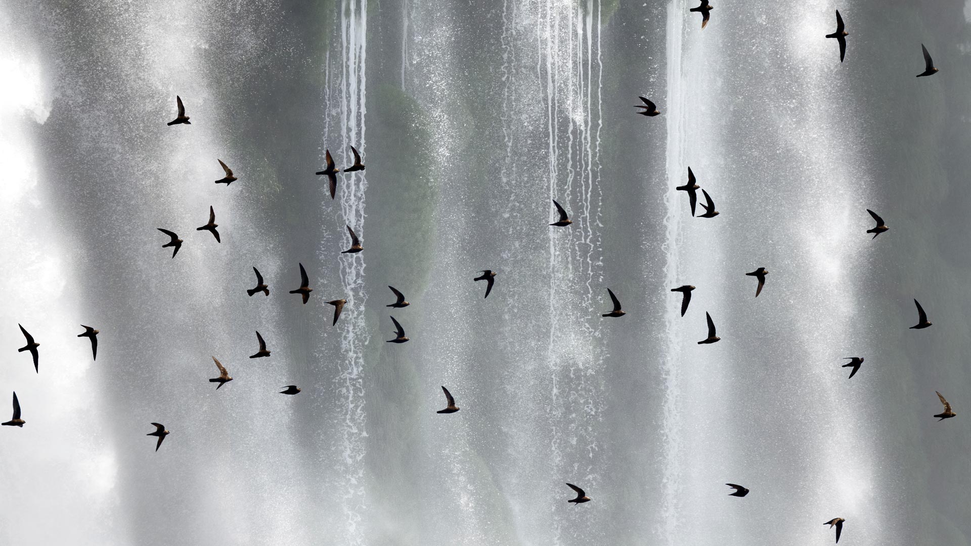 Incansáveis voadores Bando de andorinhões-velhos (Cypseloides senex) em frente às Cataratas do Iguaçu, Paraná (© Angelo Gandolfi/Minden PIctures)