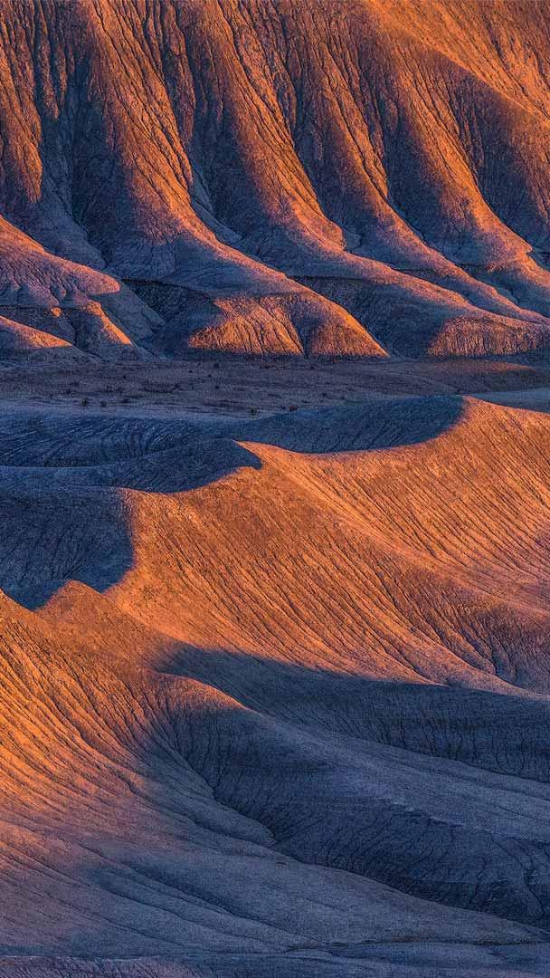 Wavy sandstone ridges stretch across the Caineville Badlands, Utah, in the United States, resembling nature"s brushstrokes on stone. These formations are made of fine-grained sediment that settled in ancient river deltas and inland seas and later hardened into stone. Over time, erosion carved through the layers, exposing flowing, ripple-like patterns. The sedimentary layers tell a story of shifting climates and ancient landscapes. The barren land, seen in today"s image, may appear lifeless, but during early spring, rainfall blankets the terrain with tiny purple and yellow flowers. Light and shadow shift throughout the day, offering photographers and visitors various angles. While much of the terrain remains rugged, some areas offer easy access, allowing visitors to explore without strenuous hiking.