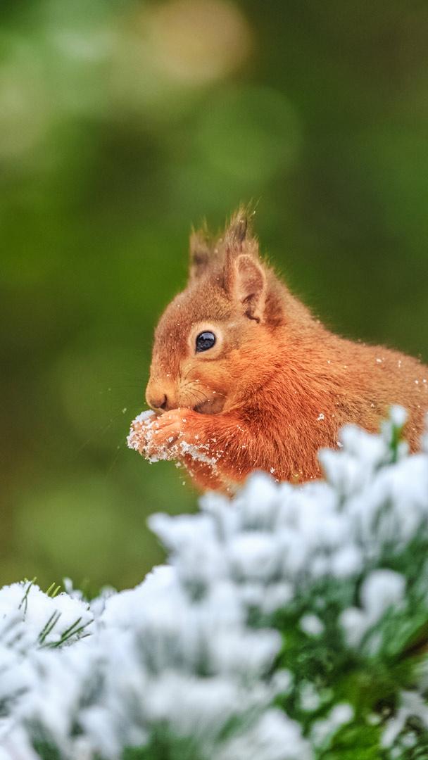 Who could resist that squishy face? A Eurasian red squirrel perches on a snowy pine branch, paws clutching a pine cone like it"s the last snack on Earth. These little acrobats stay busy collecting nuts, seeds and fungi—feasting on fresh finds in summer and on stored cones through winter.