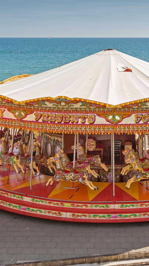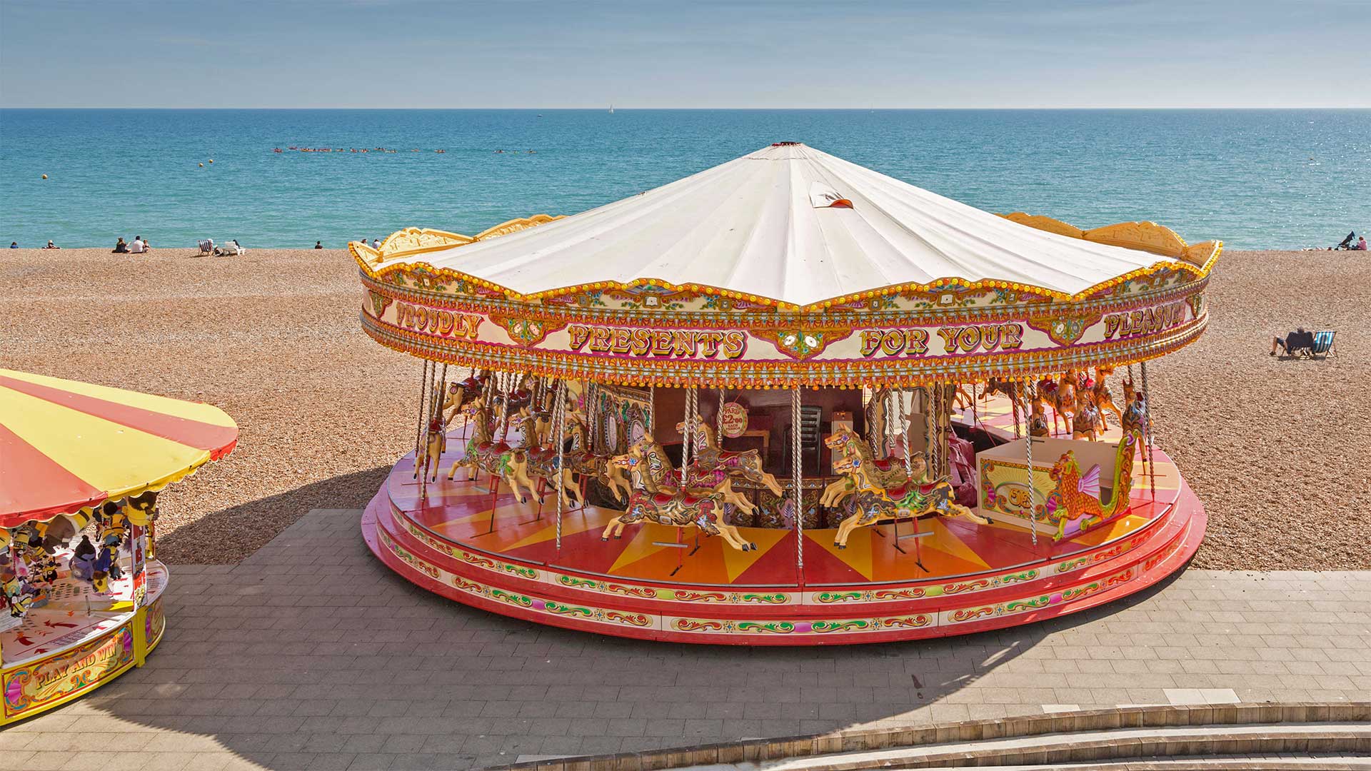 Boardwalk nostalgia Golden Gallopers Carousel on the seafront in Brighton, East Sussex, England (© Graham Prentice/Alamy)