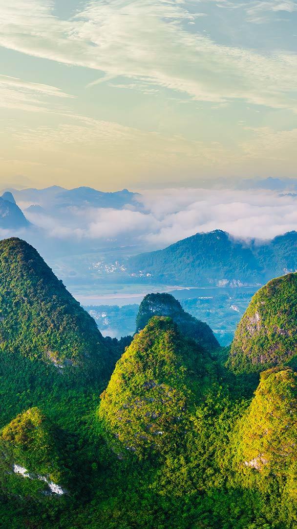 秀美壮丽的山河 日出时分,美丽的喀斯特山脉鸟瞰图,中国桂林 (© zhaojiankang/Getty Images)
