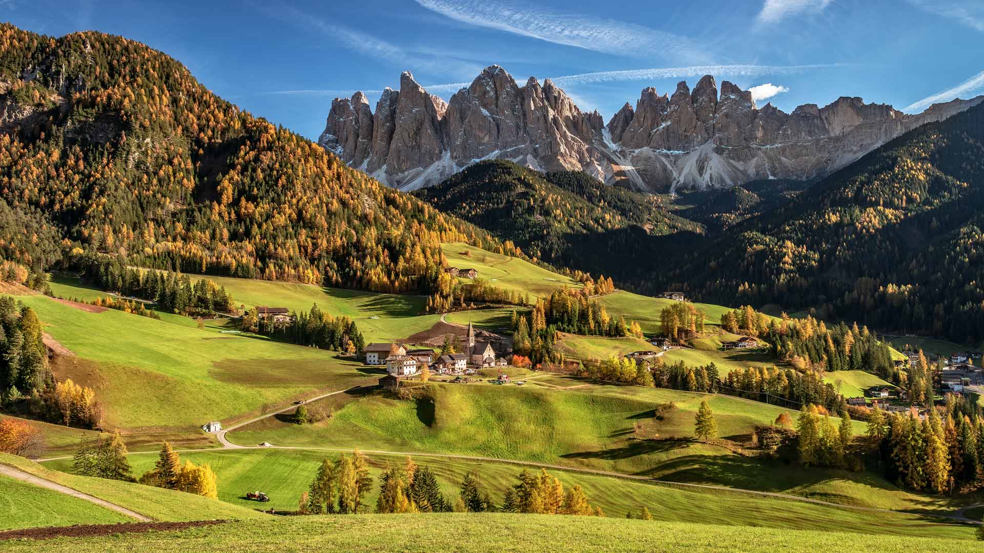 如诗如画的地方 富内斯山谷,背景是多洛米蒂山,南蒂罗尔,意大利 (© Achim Thomae/Getty Images)