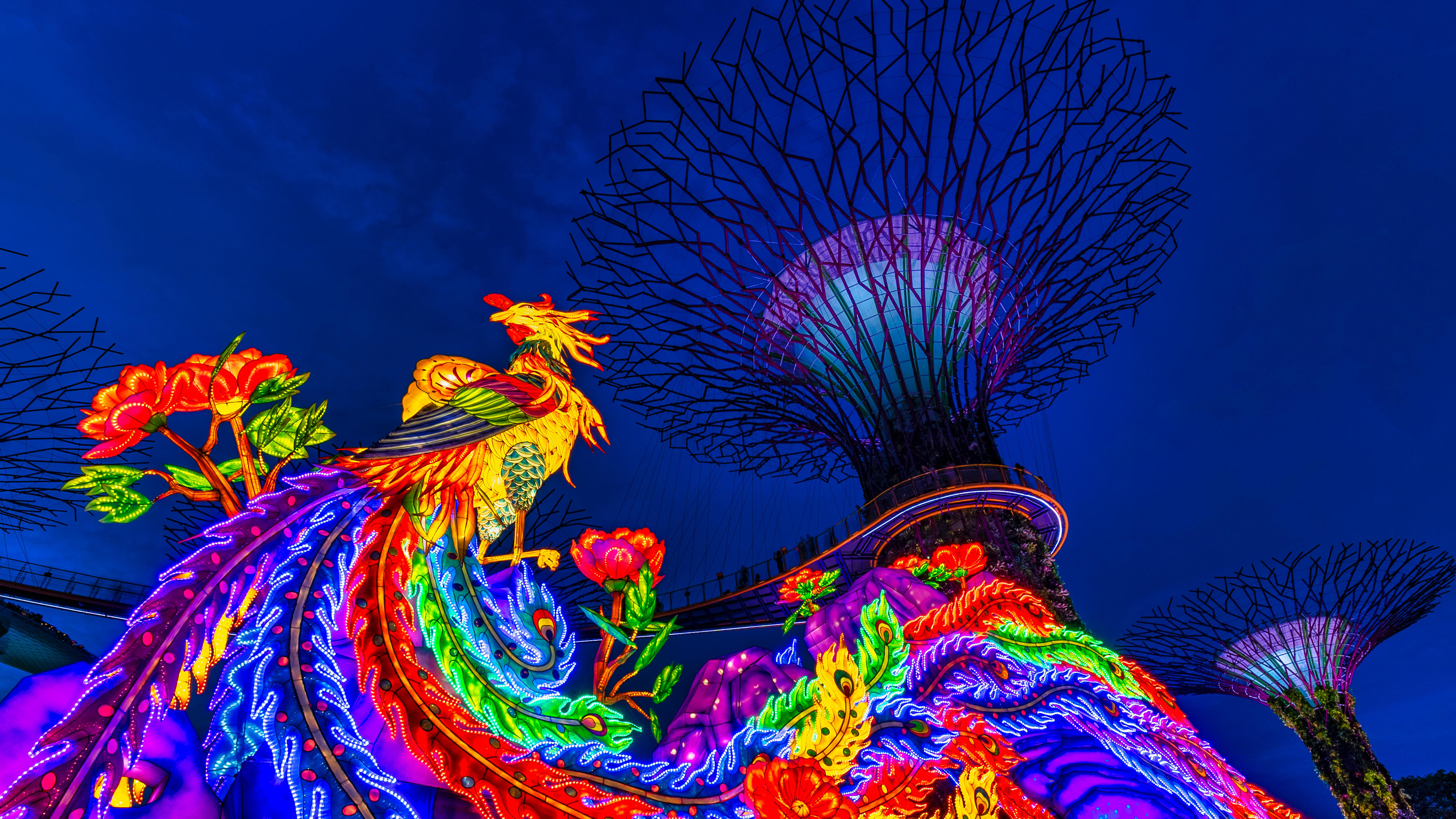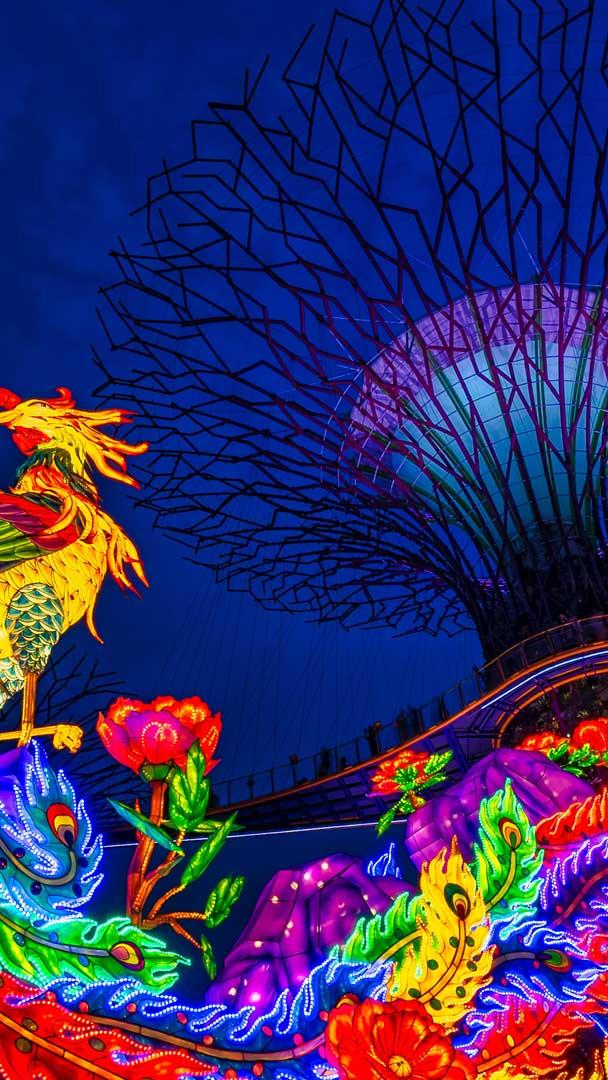 Tauchen Sie ein in die faszinierende Welt des Mondfestes – ein Höhepunkt der asiatischen Kultur, das in der Vollmondnacht des achten Monats nach dem traditionellen chinesischen Mondkalender gefeiert wird. Auf unserem heutigen Bild befinden wir uns in den Gardens by the Bay in Singapur und die Super Trees (mit Pflanzen bewachsene Stahlgerüste) erstrahlen zum Mondfest in einem Meer aus Laternen. Ein Fest, dessen Wurzeln über 3000 Jahre in die chinesische Geschichte zurückreichen, lädt dazu ein, den Vollmond zu bewundern und das Ende der Erntesaison zu feiern. Bei diesem festlichen Beisammensein essen Familien und Freunde köstliche Mondkuchen mit süßer Bohnenpaste, salzigem Eigelb oder Lotossamen. Farbenfrohe Laternen erhellen den Abendhimmel und stehen sinnbildlich für Glück und Wohlergehen.