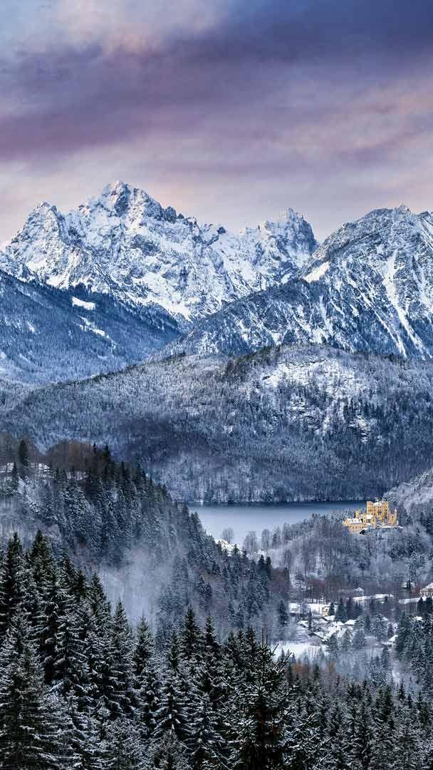 In den Bayerischen Alpen, einem majestätischen Gebirgszug in Süddeutschland, befinden sich zwei Schlösser: Neuschwanstein und Hohenschwangau. Schloss Neuschwanstein wurde im 19. Jahrhundert von König Ludwig II. von Bayern in Auftrag gegeben. Bei diesem spektakulären Anblick wähnt man sich in einem Märchen der Gebrüder Grimm oder in der Fantasie eines Disney-Malers. Zwischen Gipfeln und Bächen könnte man Drachen, Prinzessinnen, Ritter und die sieben Zwerge vermuten.