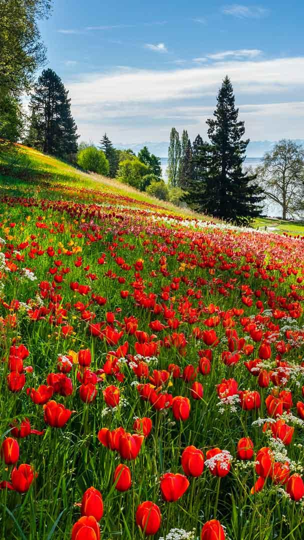 Ein farbenprächtiger Blumenteppich Tulpenblüten auf der Insel Mainau, Bodensee (© Reinhard Schmid/Huber/eStock Photo)