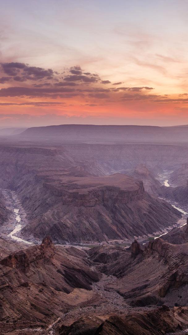 In Namibia haben Sie die Qual der Wahl. Vom tropischen Regenwald über die Wüste bis hin zu diesem spektakulären Canyon. Die Namib-Wüste ist eine der wenigen Küstenwüsten der Welt und der größte Fluss des Landes - der Fischfluss - hat im Laufe von Jahrmillionen den größten Canyon des afrikanischen Kontinents gegraben. Es ist der Fischfluss-Canyon, der sich rund 160 Kilometer durch verwittertes Gneis- und Dolomitgestein schlängelt und fast 600 Meter tief ist.