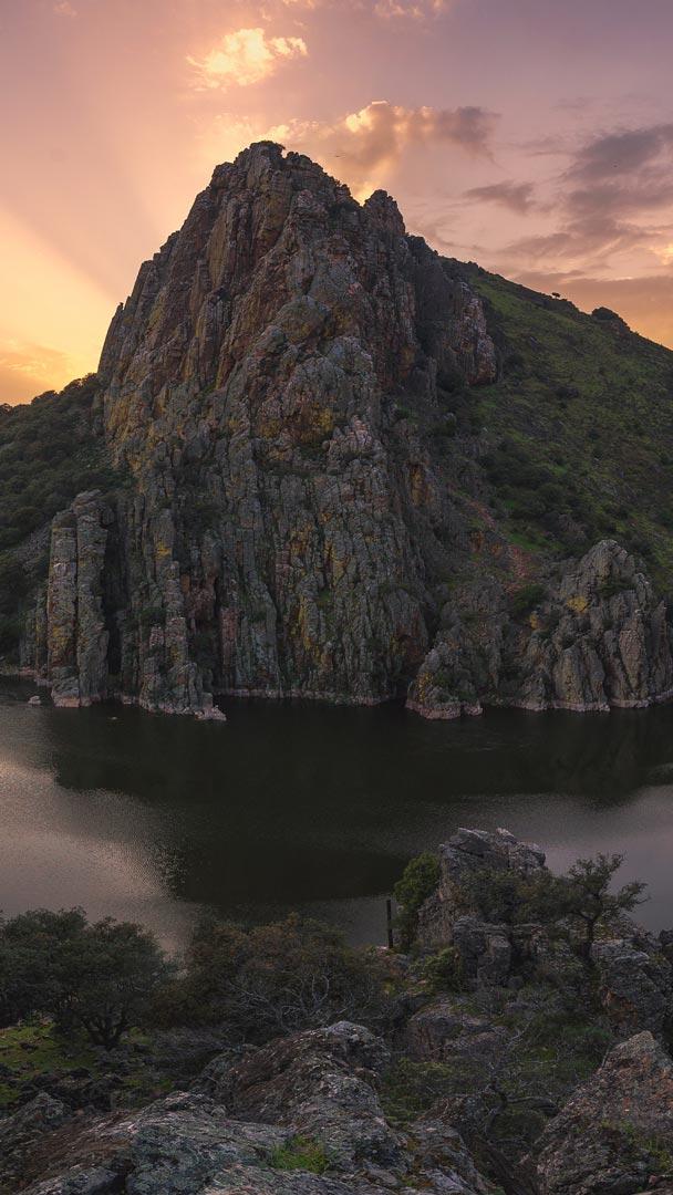 Descubre el Parque Nacional de Monfragüe, un tesoro natural en el corazón de Extremadura. Desde el mirador del Salto del Gitano, en Cáceres, se contempla uno de los atardeceres más bellos de España, entre riscos de piedra y cielos teñidos de fuego. Dos ríos atraviesan el parque —el Tajo y el Tiétar—, modelando su paisaje escarpado y alimentando una gran diversidad de fauna y vegetación mediterránea. Este paraíso es ideal para los amantes de la naturaleza y las aves. En libertad, sobrevuelan el parque el buitre leonado —con la mayor colonia de Europa—, el águila imperial ibérica y el alimoche, entre otras especies que lo convierten en un referente de la biodiversidad.