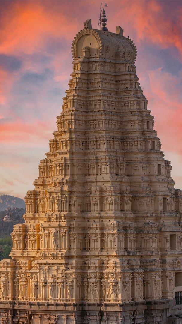 In the heart of Hampi, on the bank of the Tungabhadra River, the Virupaksha Temple is a stunning stone-crafted structure and the centerpiece of Vijayanagara, India. The temple is a complex combination of intricate Dravidian and Vijayanagara architectural styles, showcasing finely carved pillars, ornate mandapas and a towering gopuram. The superstructure was constructed from brick and mortar, with numerous captivating stucco figures adorning the exterior of the first tier. While there is intricate detail up close, a bit of distance showcases the full spectacle of the building. A highlight of the temple is the Hampi Bazaar—a street market that leads to the temple"s entrance. This lively place is lined with various stalls reminiscent of the historic trade and commerce that flourished in the area.