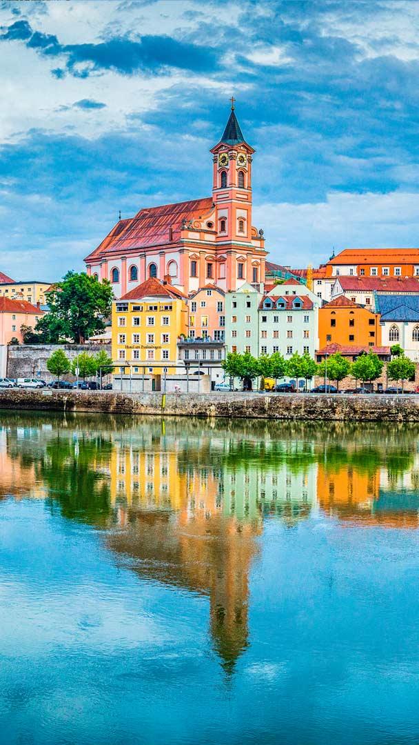 Blue Skies in Beautiful Bavaria The city of Passau reflected in the Danube, Bavaria, Germany (© Scott Wilson/Alamy)