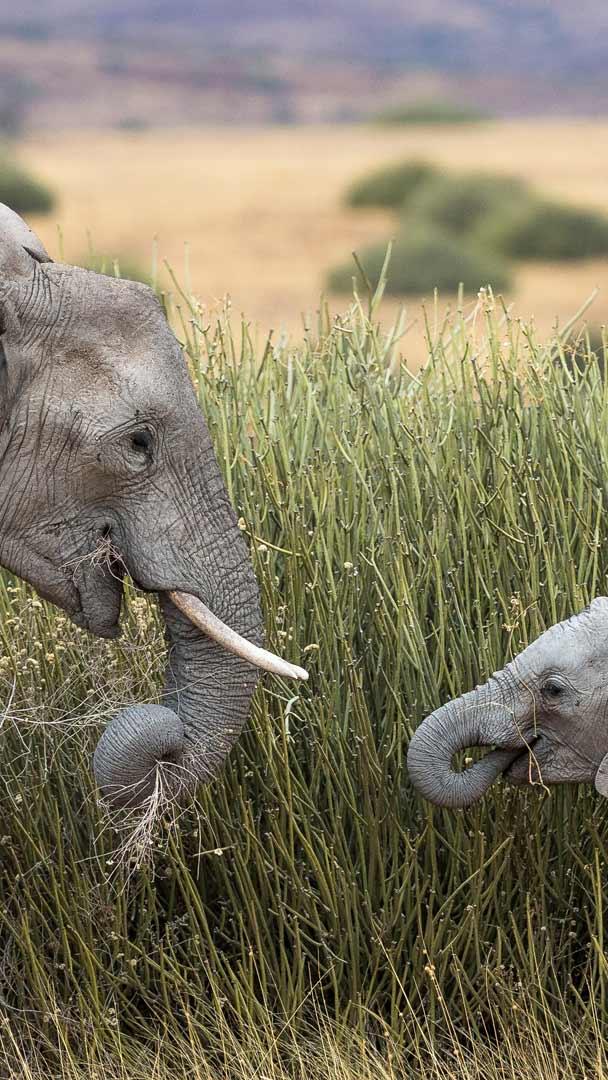 Più uniti di così? Elefante del deserto con cucciolo che si nutre di erba alta, Namibia (© Christophe Courteau/Minden Pictures)