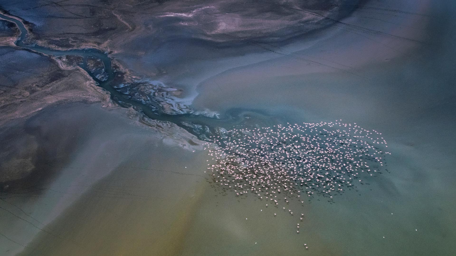 Un’occhiata dall’alto Fenicotteri minori che volano sul Lago Magadi, Kenya, Africa (© Vicki Jauron, Babylon and Beyond Photography/Getty Images)