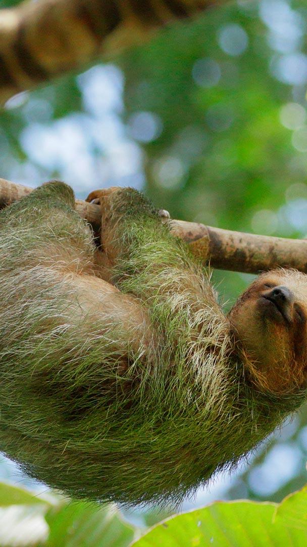 Ciao a tutti, dal mondo a testa in giù! Bradipo tridattilo dal collo marrone che dorme su un albero di cecropia, Costa Rica (© Juan Carlos Vindas/Getty Images)