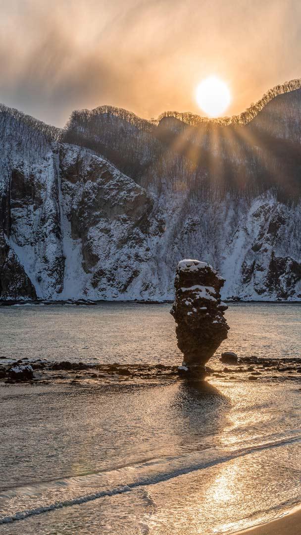 明けましておめでとうございます。今年も Bing をよろしくお願いします。今年最初の Bing は、北海道余市町の海上から、えびす岩と大黒岩の向こうに昇る日の出をお届けします。冬の海に朝日が反射し、岩影が静かな水面に映る幻想的な光景が広がっています…