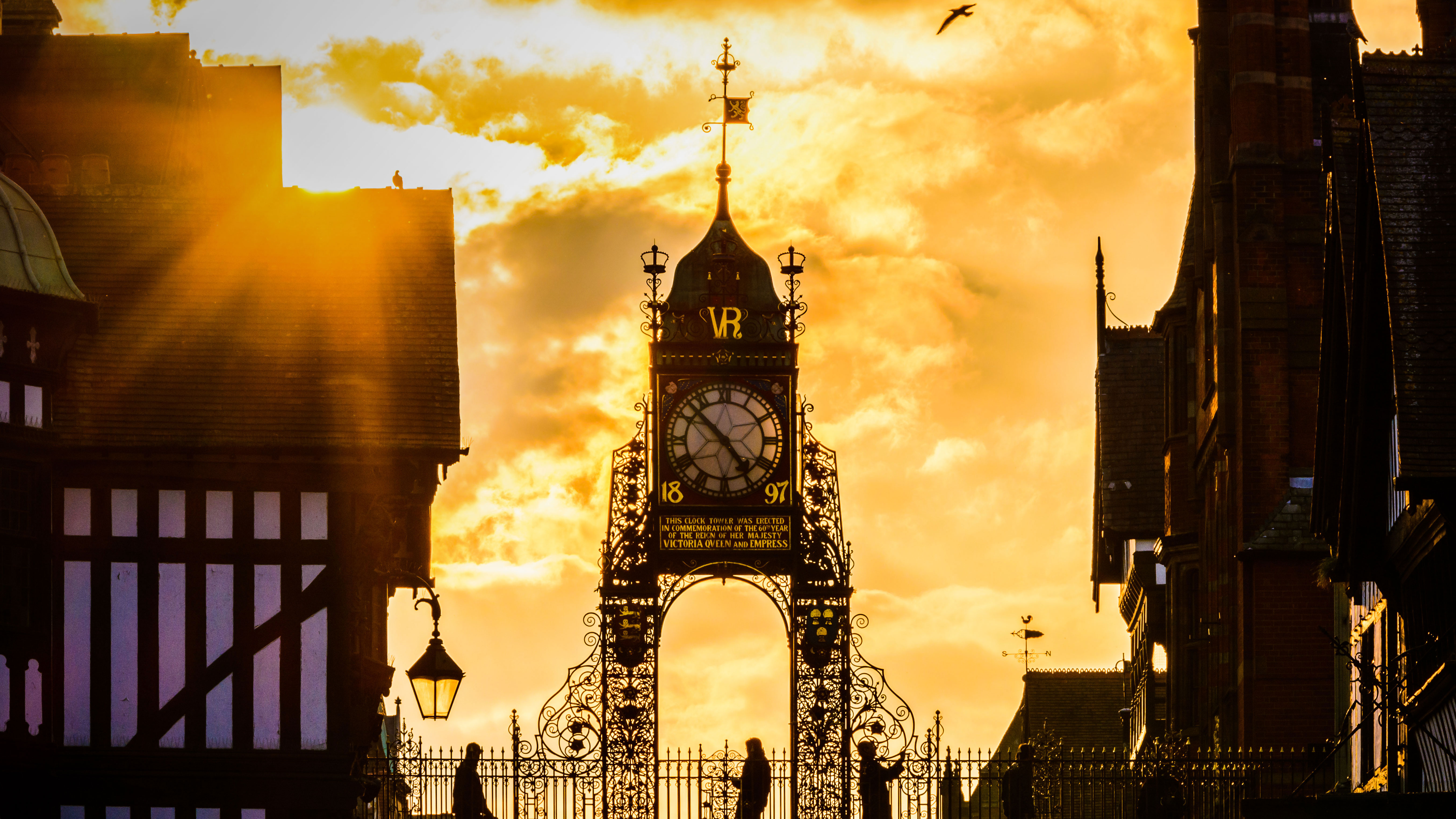 The sun sets on British Summer Time The sun sets over the Eastgate Clock in Chester. (© ZinCat/Getty Images)