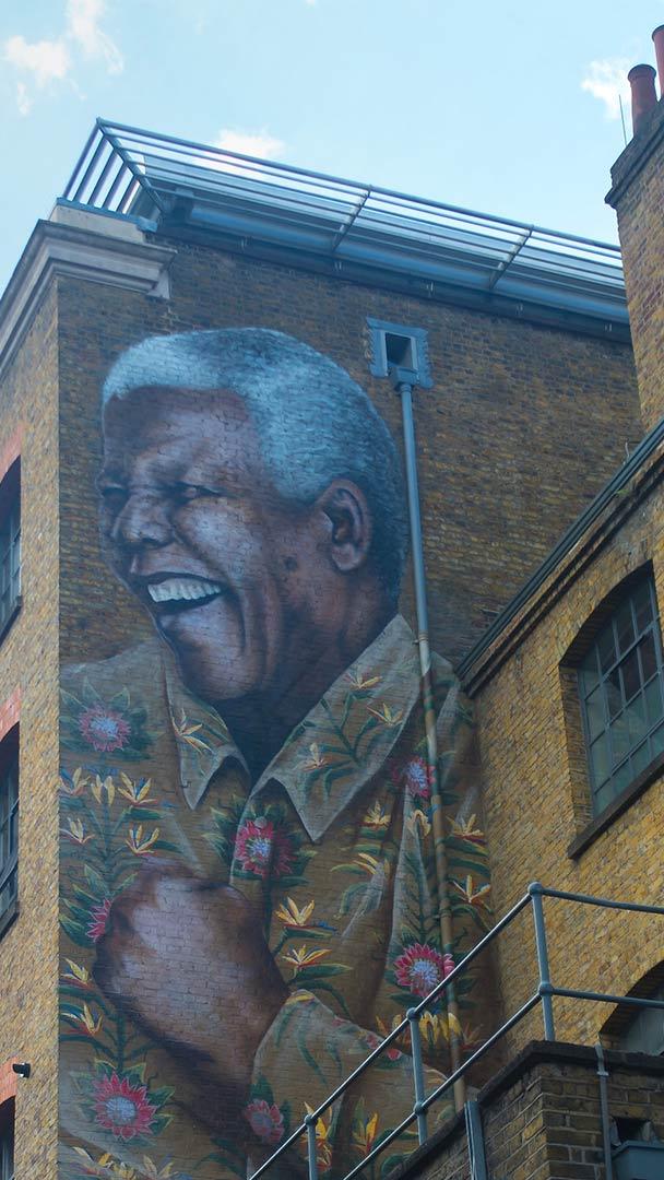 Black History Month begins A giant portrait of Nelson Mandela on a wall in Camden, London. (© NurPhoto/Contributor/Getty Images)