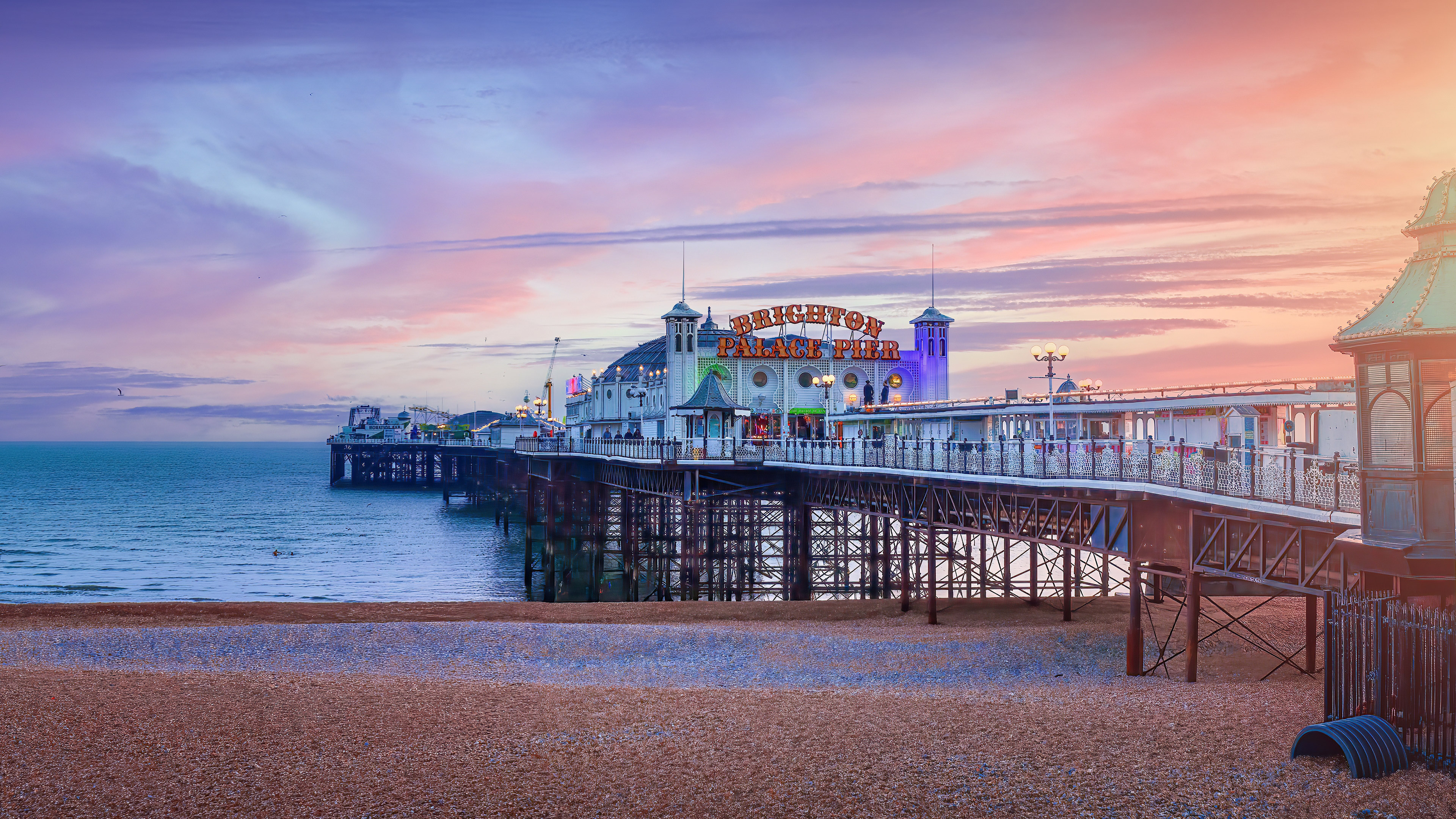 Rides above the tide Brighton Pier at sunset, England, UK (© Peppy Graphics/Shutterstock)