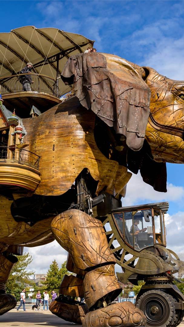 Created by François Delarozière, Pierre Orefice, and their team of artists and engineers at La Machine Company workshop, the Grand Éléphant was the first of three artworks/attractions constructed for the Machines de l’île (Machines of the Isle) in Nantes. The elephant is a mechanical sculpture that’s so big it can take up to 49 passengers for a 45-minute walk. After unveiling the elephant in 2007 and the Carrousel des Mondes Marins (Marine World Carousel) in 2012, they"re now working on an ambitious third project, L’Arbre aux Hérons (Tree of Herons), scheduled for 2022. The efforts of these visionary creators have turned a shuttered industrial shipyard on the Loire River into a unique place where art, architecture, tourism, and urban planning come together to delight all who visit.