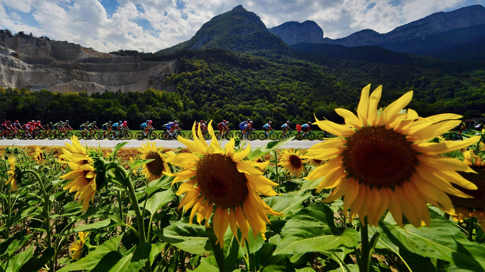 Racers pushing past sunflowers in the 2018 Tour de France © Justin Setterfield/Getty Images