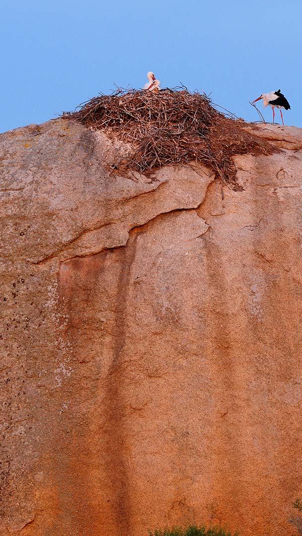 It’s migration season for white storks, shown here tending to a nest at Los Barruecos Natural Monument in central Spain. This destination is known for large, granite boulders intermixed with sculptures created by local artists—and it’s a favorite stork nesting spot. When the storks arrive here in springtime for their nesting season, the area can be filled with the sound of the storks’ loud bill-clattering, a tap-tap-tapping that can be heard from great distances. In August and September, white storks depart their nests for a 25-day trip south to their African wintering grounds, where they gather in large flocks. The species returns to Europe again nine months later—hence its unique role in folklore, giving parents a low-stress way to answer the question ‘where do babies come from?’