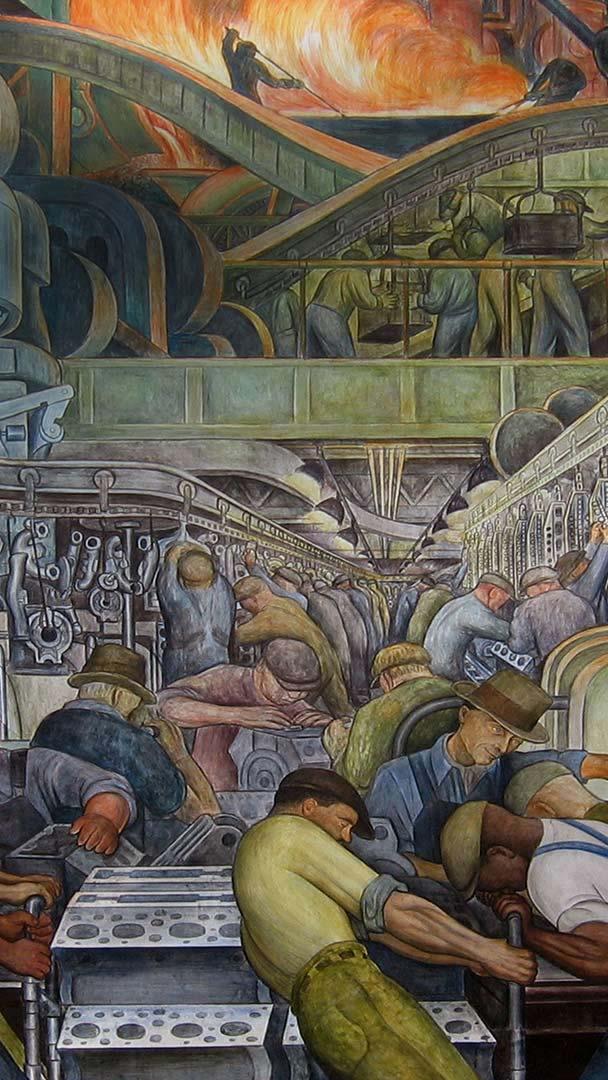 Diego Rivera"s "Detroit Industry Murals" show off the Mexican painter"s incredible attention to detail in his depiction of the American labor industry in the early 20th century. The portion on our homepage today is from the north wall panel, and shows a busy shift at an automotive factory. It"s one of 27 frescoes that make up this collection of wall-sized paintings.