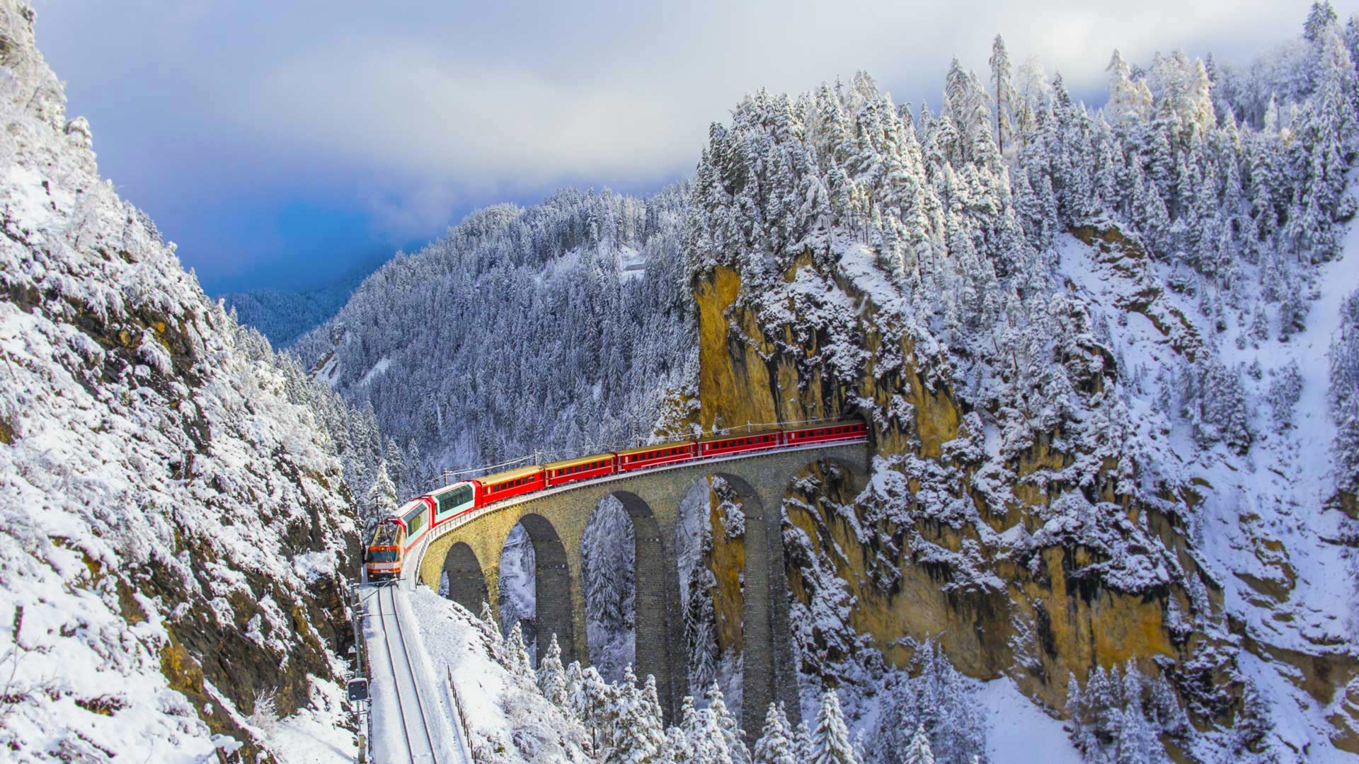 Often called the most beautiful train ride in Switzerland, if not the world, the Bernina Express offers spectacular views on its sightseeing routes that connect towns in southeastern Switzerland to Tirano, Italy. It"s been in operation here since the late 1800s. The classic route takes about four hours and departs from Chur, Switzerland. Outfitted with panoramic windows, the train passes through 55 tunnels and over 196 bridges, some more than 100 years old, like the Landwasser Viaduct pictured on our homepage today. The cheerful red train winds its way up and over the Bernina Pass in the Alps, reaching an elevation of 7,392 feet. Pay special attention during the stretch from Thusis to Tirano—this portion of the route was designated a World Heritage site in 2008. Reservations recommended!
