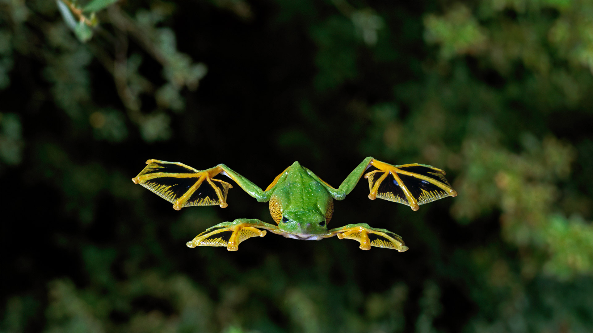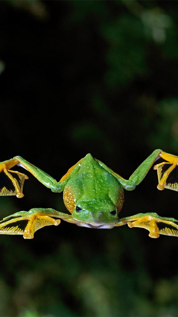 For leap day (the extra day added to February every four years), we"re looking at a Wallace"s flying frog. Also known as parachute frogs, these critters live in the tropical jungles of Malaysia and Borneo. They spend most of their time in trees, gliding down to the ground to mate and lay eggs. They "fly" by leaping and using their webbed fingers and toes to glide as far as 50 feet.