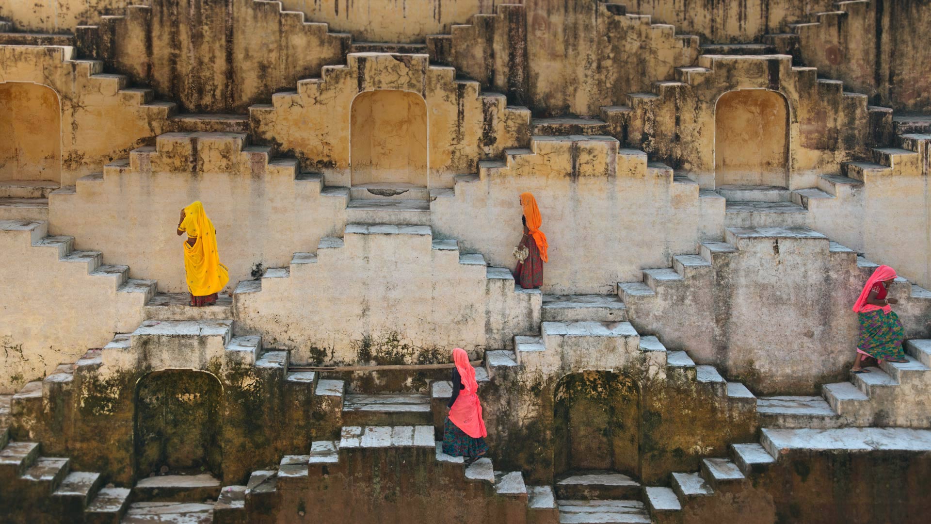 The stepwell that these women are climbing is an apt image to mark World Water Day. Stepwells originated in western India over a thousand years ago as way for locals in that arid climate to easily and reliably access fresh water—even during the driest months. The Panna Meena Ka Kund stepwell in Jaipur is a classic example of the beautiful, regular, geometric architecture used to produce these useful public works. Most stepwells also feature shaded side chambers where locals (primarily women) can gather to escape the heat of the day.