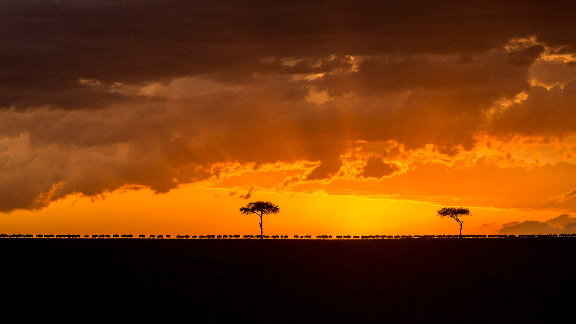 Each year, as many as 1.5 million blue wildebeest move through the Serengeti region of eastern Africa, traveling in a roughly 800-mile loop through Tanzania and Kenya as they chase lush, green grass and fresh water. When resources are depleted in one area, the animals move to another. Late summer often finds them in Kenya"s Maasai Mara National Reserve, shown on today"s homepage. The speedy wildebeest (the species can run up to 50 mph!) is not alone in its journey; hundreds of thousands of zebras, gazelles, and elands accompany the herd. The great number of animals makes this phenomenon one of the largest land migrations on Earth, often called the World Cup of Wildlife.