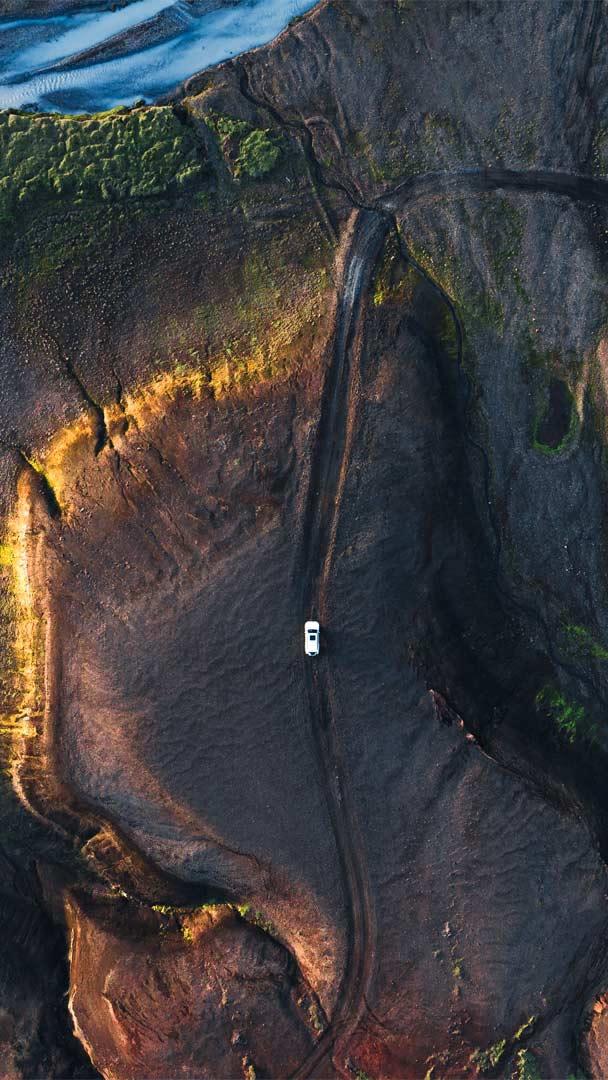 There"s a good chance the occupants of that car you can see in this photo, winding along a remote highway in the Highlands of Iceland, won"t encounter any other visitors to this desolate region. Accessible only during the summertime, roads across the Icelandic Highlands pass through mostly uninhabited volcanic desert. Frequent volcanic activity in the area creates a porous topsoil full of chemical compounds that aren"t conducive to plant growth. Besides, much of the rainfall is quickly absorbed so plant life only appears alongside glacial rivers. Despite this seemingly unwelcoming environment, adventurous travelers come to the Highlands every summer to see firsthand an ecosystem so unearthly that NASA conducted training missions here for some of its Apollo astronauts.