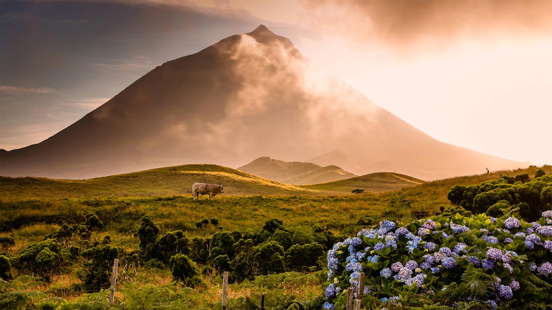 A bull, some flowers, and a stratovolcano © Atmo-Sphere/Getty Images