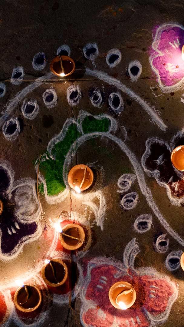 During Diwali, the five-day festival of lights, vibrant patterns of all shapes and sizes are created on the floor out of materials such as colored rice, sand, and flower petals. The charming Indian folk art, called rangoli, is usually made near the entrance of a home to welcome guests and deities, and is said to bring good luck on special occasions. Celebrations might be a bit different this year, but buildings will still be brightened by these decorative drawings, twinkling lights, and small oil lamps, known as diyas.