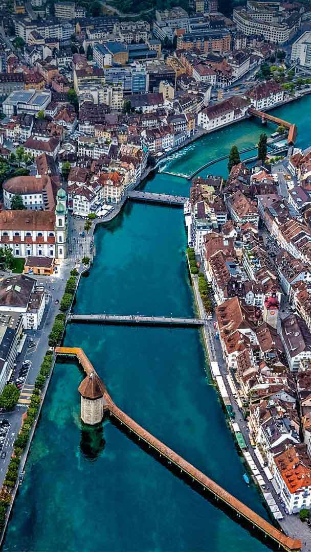 We"re in the heart of Switzerland looking down on the compact city of Lucerne, in a charming waterfront setting along the shores of its namesake lake and the River Reuss. Surrounded by snow-capped mountains just out of frame, Lucerne lies in the German-speaking part of central Switzerland and is divided into two parts linked by a series of bridges. The most famous of these bridges—the centerpiece and symbol of Lucerne—is the Kapellbrücke (Chapel Bridge), a covered wooden footbridge that you can see spanning diagonally across the Reuss in our photo. The building rising from the river alongside the footbridge is a medieval water tower, which has been used as a prison, torture chamber, local archive, and treasury.