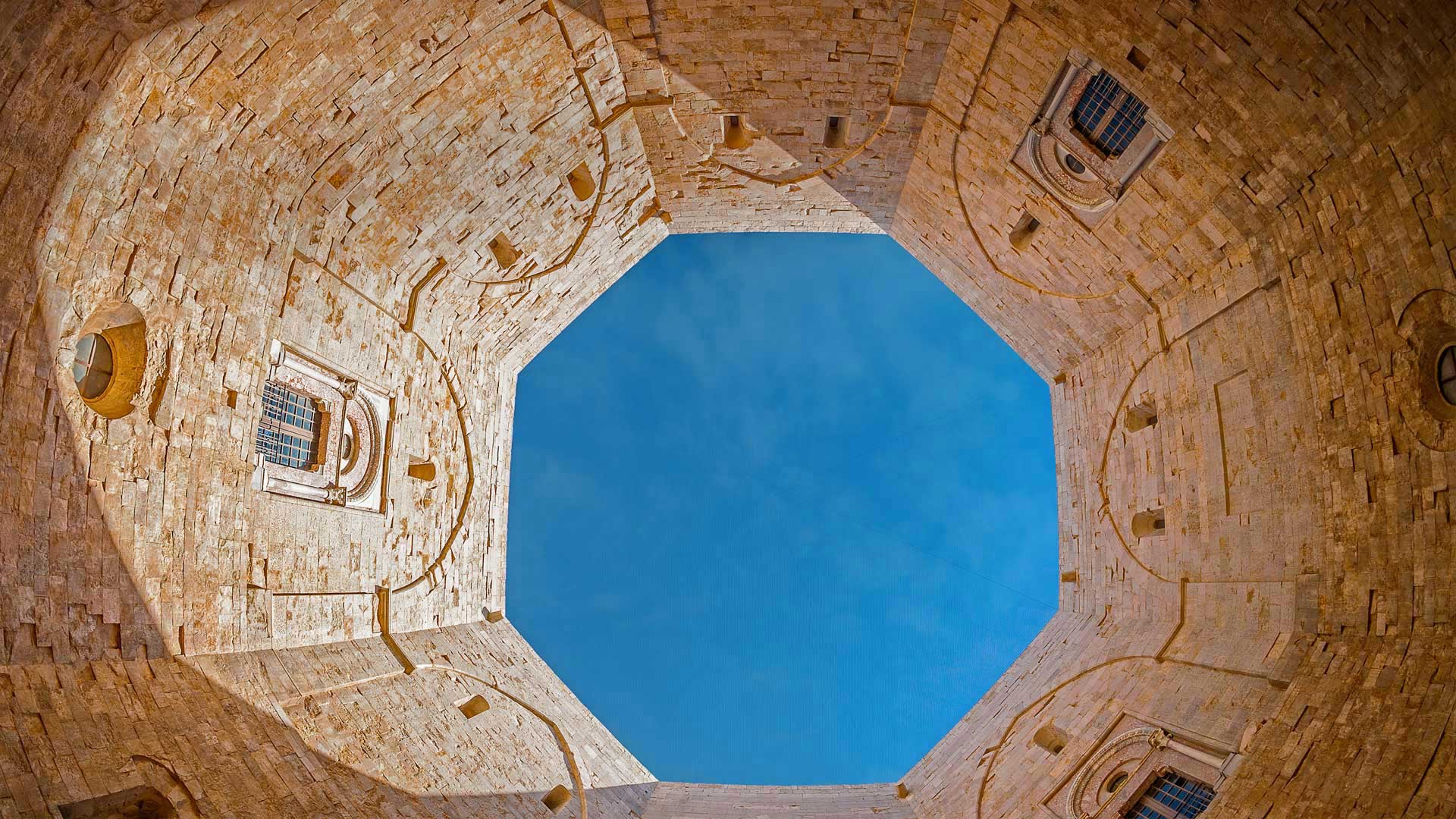 Built in the 1240s by the Holy Roman Emperor Frederick II in southeast Italy, Castel del Monte (Castle of the Mount) features an unusual octagonal design. Eight stone walls stretch between eight octagonal towers and enclose an octagonal courtyard. Each of the two floors also has eight trapezoidal rooms. Acclaimed and protected as a World Heritage Site in 1996, the castle symbolically reflects a harmonious integration of classical Roman, Arabic, and medieval architecture and design—and to some, its octagonal symmetry suggests a connection between heaven and earth.
