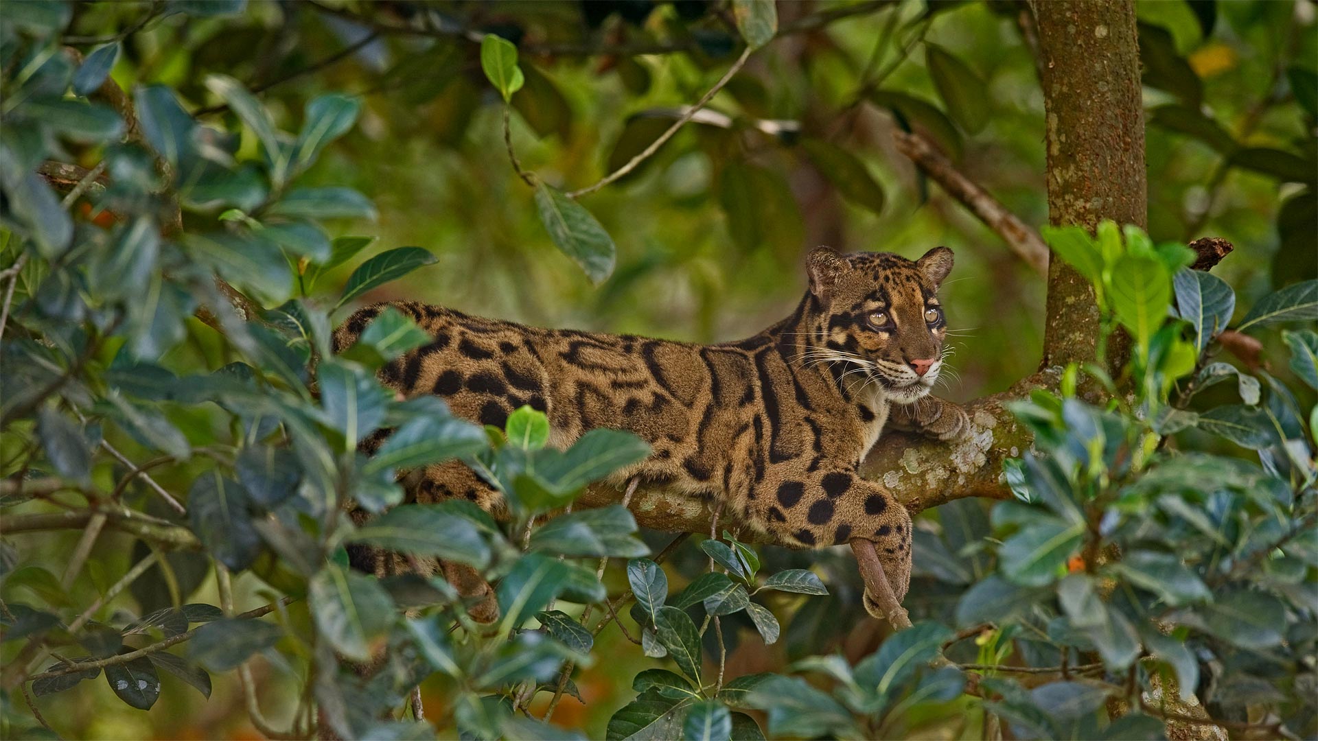 With short, limber legs and a long tail, the clouded leopard is perfectly adapted for living in the trees. Flexible ankle joints allow it to descend trunks headfirst, one of only two cat species that can pull this off. A long tail provides stabilizing balance for leaps between trees. Sharp, retractable claws let this jungle climber dangle off branches in all sorts of gravity-defying positions.