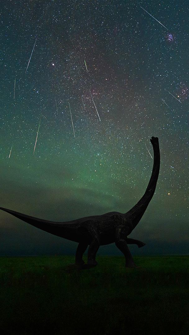 These dinosaurs are (nervously?) looking at the annual Perseid meteor shower, photographed at the Dinosaur Museum of Erenhot in the Inner Mongolia Autonomous Region of China. Known as Dinosaur City, Erenhot gained attention in the 1920s when dino fossils were found there. It"s believed that more than 20 kinds of dinosaurs lived in the area during the Cretaceous Period around 70 million years ago.