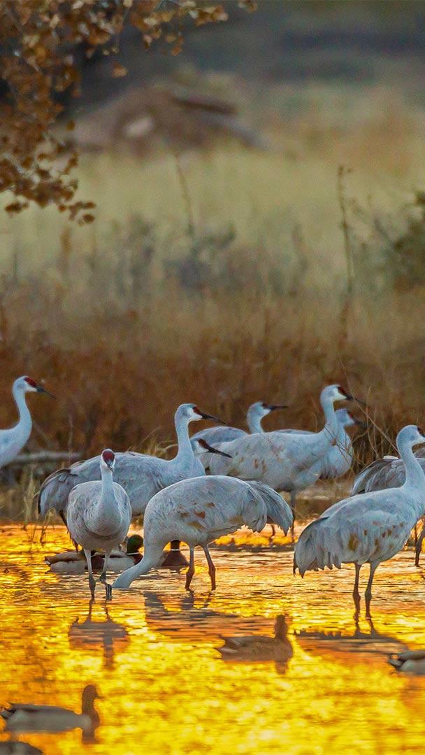 For World Migratory Bird Day, we"ve journeyed down to Bosque del Apache National Wildlife Refuge in southern New Mexico to join a group of sandhill cranes and their mallard duck friends as they feed in shallow water. Each year beginning in late October, this 57,000-acre refuge becomes the winter home to tens of thousands of migratory birds including sandhill cranes and various species of geese and ducks who travel from as far away as Alaska and Siberia to hunker down in warmer climes. They stay until late February when they begin their journey back north to their summer homes.
