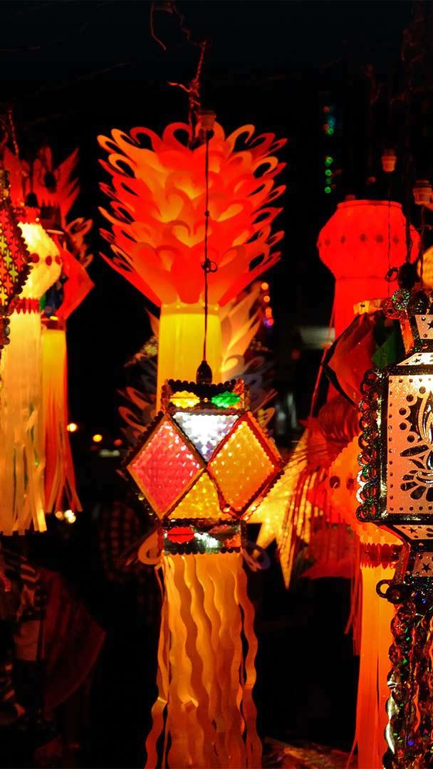 Diwali is a five-day celebration of the symbolic victory of light over darkness, good over evil, and knowledge over ignorance. Though Diwali is one of the most important festivals of the Hindu faith, it is also embraced by Sikhs, Jains, and even some Buddhists. Celebrants often decorate their homes with oil lamps called diyas and create colorful patterns on the floor known as rangolis. Streets, markets, temples, and other public spaces are also illuminated with hanging lanterns like those seen in our homepage photo.