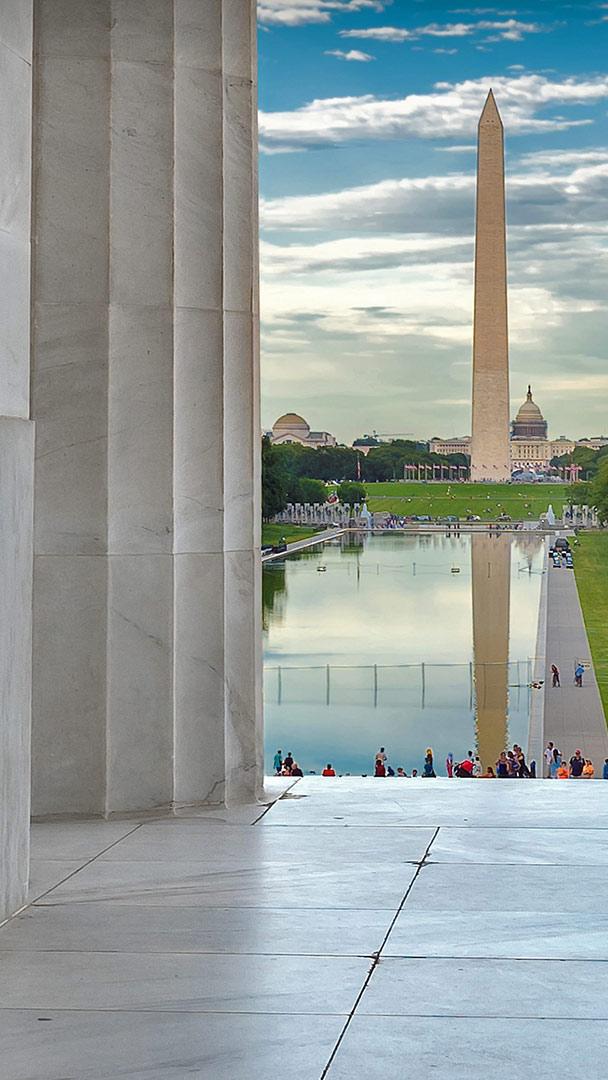 On Presidents Day, we take you to Washington, DC"s National Mall, the downtown park known as "America"s front yard." Here, from the front steps of the Lincoln Memorial, you can see all the way across to the Capitol Building, with the tall, white obelisk of the Washington Monument rising in between.