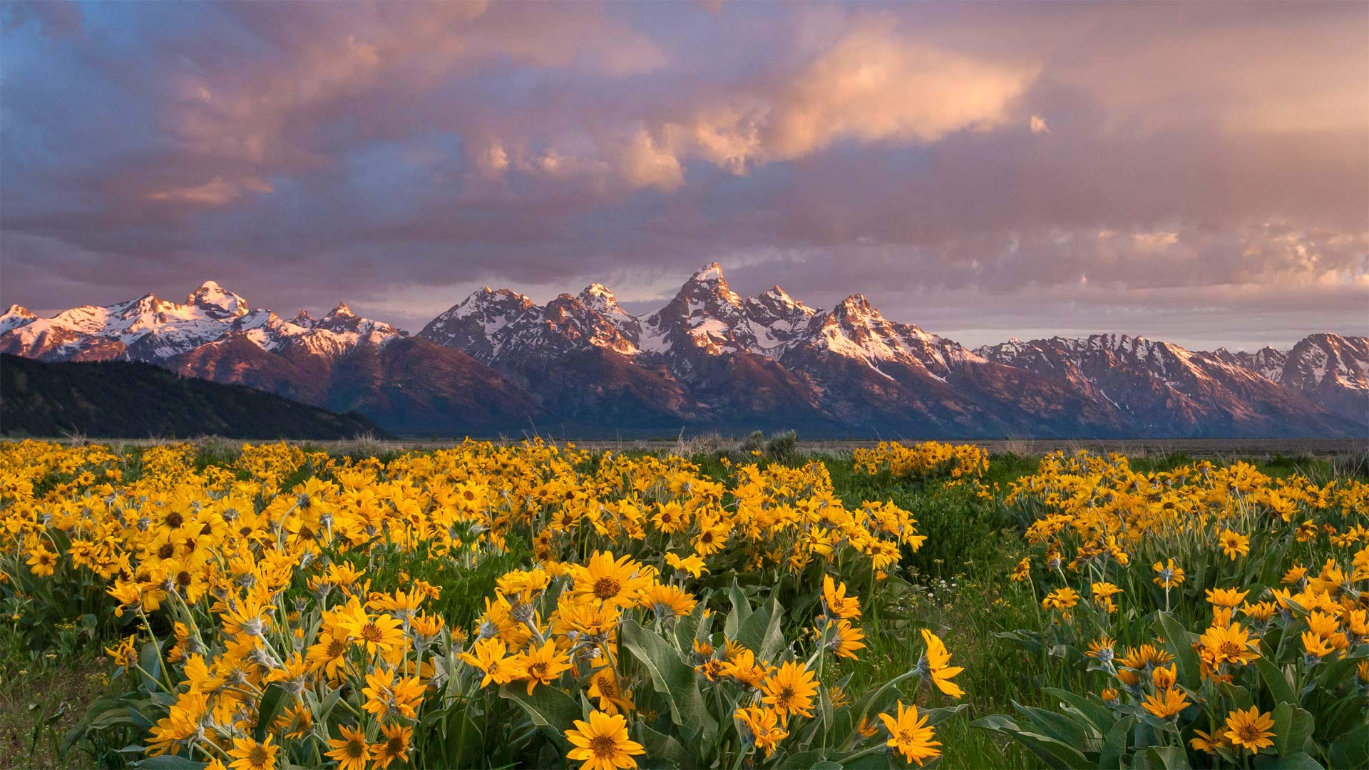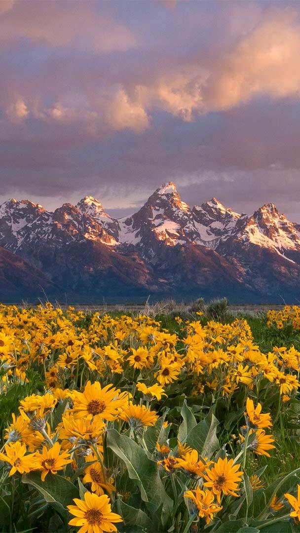 These arrowleaf balsamroot wildflowers, commonly known as Oregon sunflowers, have a grand view of the Grand Tetons from the valley below the towering range. The region"s harsh weather means that only the hardiest of wildflowers can survive, and the bright yellow arrowleaves fit the bill. The plants are drought-tolerant, impervious to winter, tenacious against trampling, and even fire-resistant, with a taproot that regenerates leaves and flowers after the top has burned.