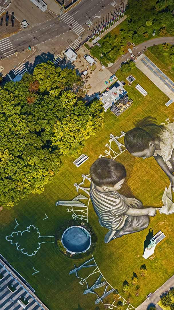 Color, creativity, and fun are three things that go along with being a kid, so what better way to illustrate World Children"s Day than with this huge (we"re talking more than 100,000 square feet!) piece of "land art" in New York City, painted by the French-Swiss artist known as Saype. Gifted to the United Nations by Switzerland in honor of the UN"s 75th anniversary, "World in Progress II," shows two children busily drawing and using origami to create their ideal world.