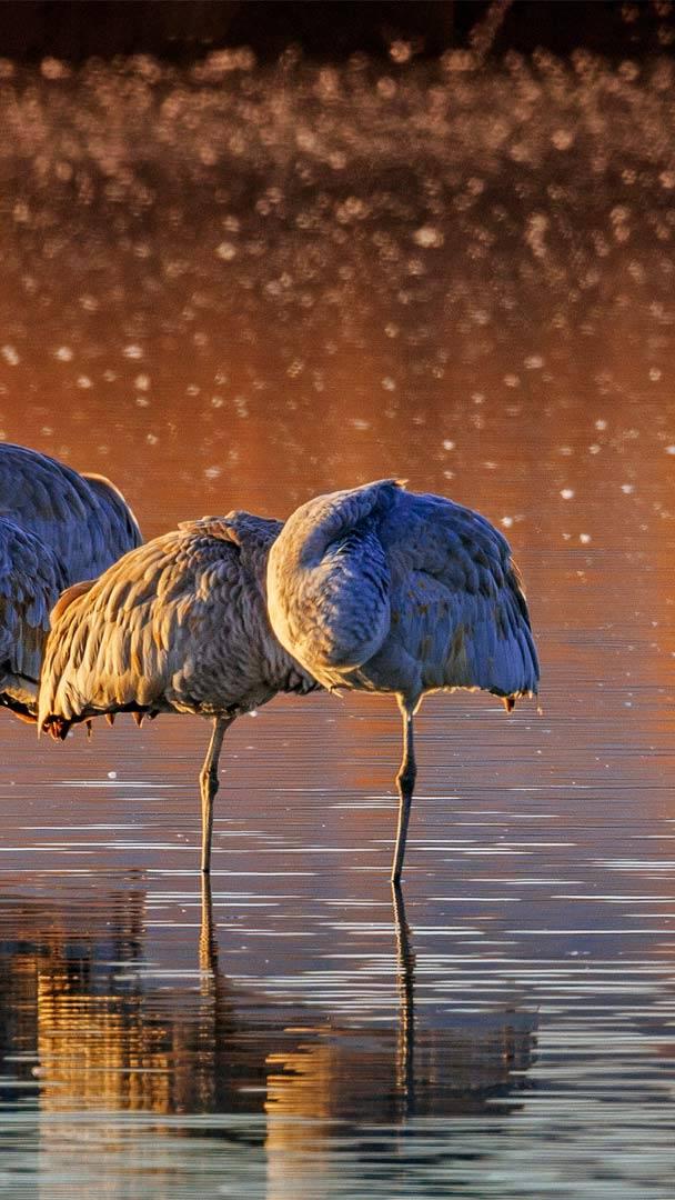 Hey, don"t judge. Migrating takes it out of you! Yes, these sandhill cranes are sleeping on their feet in the waters of the Bosque del Apache National Wildlife Refuge in southern New Mexico. The birds start arriving around Halloween each year, and as many as 10,000 of them will stay to rest and feed in local fields until February. What"s on the menu? Well, sandhill cranes aren"t picky; they"ll eat whatever"s available, from plants and grains, to insects, snails, and even snakes. And they have plenty of avian company at this beautiful refuge each winter—whooping cranes, ducks, and snow geese from as far away as Alaska and Siberia also count Bosque del Apache as a favorite resting spot before heading north to their breeding grounds when the days get warmer. Thankfully, there"s plenty of room to spread their wings at the 57,000-acre refuge.