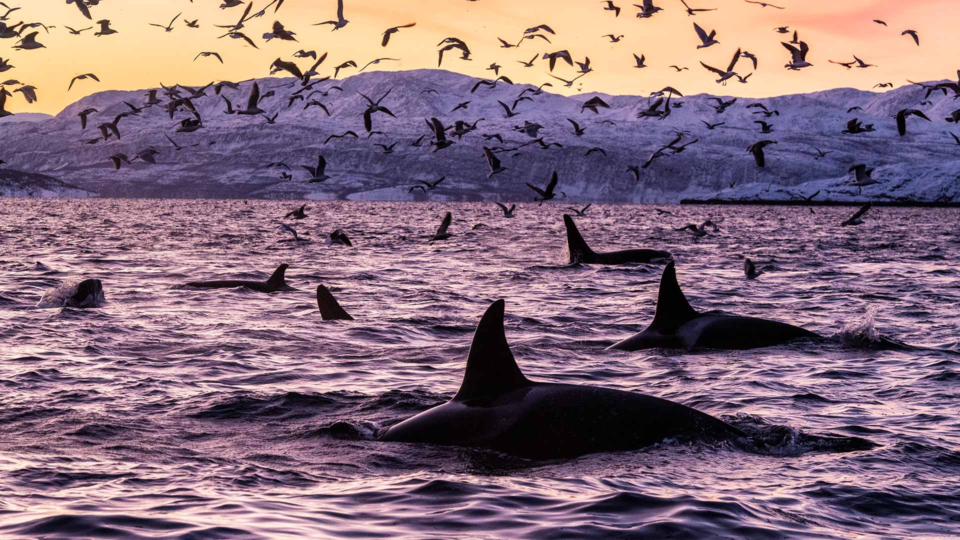 On World Wildlife Day, we"re in the ice-cold waters around the Norwegian island of Spildra with a pod of orcas, also known as killer whales. These apex predators are at the top of the food chain with a diet that includes a smorgasbord of sea creatures including fish, penguins, and even sharks and whales. They hunt in pods, family groups of up to 40 individuals that work together using special hunting techniques sometimes likened to packs of wolves. Despite their scary name, they almost never attack humans and there are no documented cases of wild orcas killing anyone. The name "killer whale" is thought to come from Spanish sailors who saw groups of them hunting big whales. Orcas are also the largest member of the oceanic dolphin family, Delphinidae.