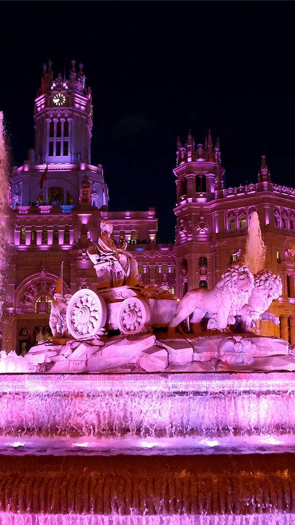 On International Women"s Day, we"re at Madrid"s iconic Cibeles Fountain and City Hall, which have been lit up in purple—one of the day"s official colors, representing justice and dignity. Each year, marchers pass by the Great Mother of the Gods on her chariot drawn by lions, as they turn out in their thousands to campaign for gender equality in Spain"s capital city.