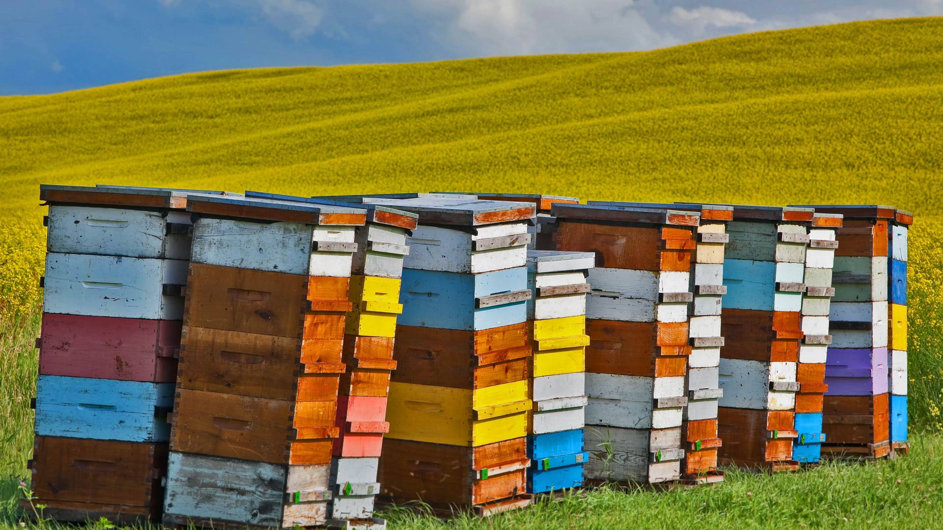 Why are dozens of colorful boxes stacked in this field? To provide homes inside their walls for millions of honey bees, those hardworking pollinators, producers of honey, and tormenters of Winnie-the-Pooh. Wild honey bee colonies build their nests in trees and caves, but manmade boxes also do the trick, and humans have been building their own beehives since antiquity. The modern beehive boxes shown here contain frames to hold honeycombs that bees produce to store their honey, pollen, and young. When the bees have produced plenty of honey, the beekeeper can simply remove the frames to extract some of it, leaving the rest to nourish the hive.